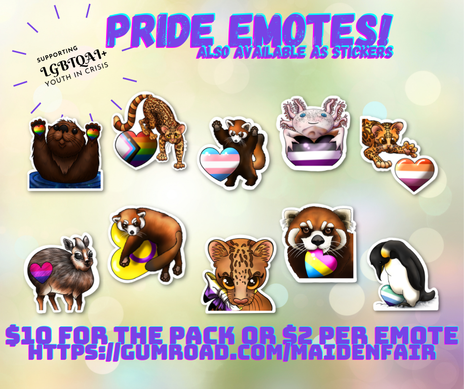 10 different emotes all representing many different pride flags and featuring adorable animals.